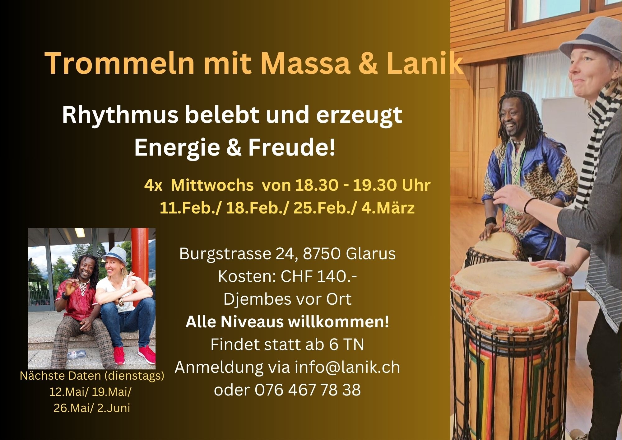 Kosten: CHF 140.-, Djembes werden zur Verfügung gestellt, mind. 6 TN