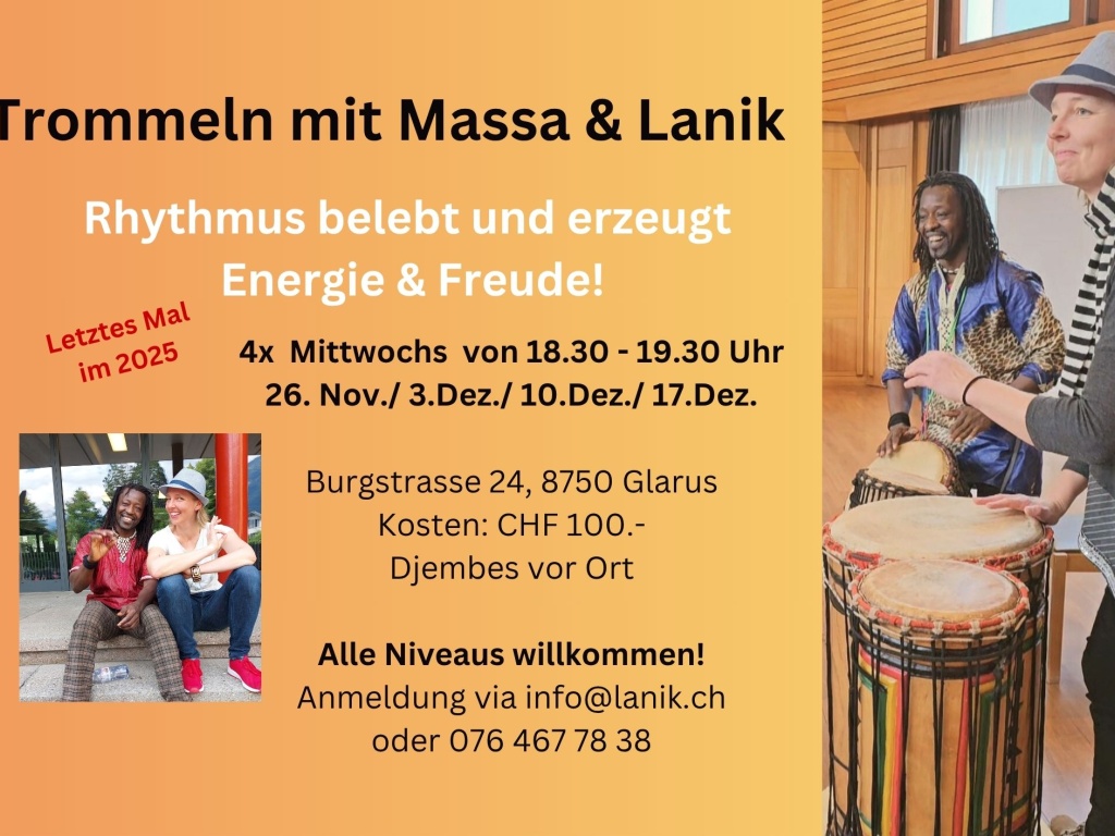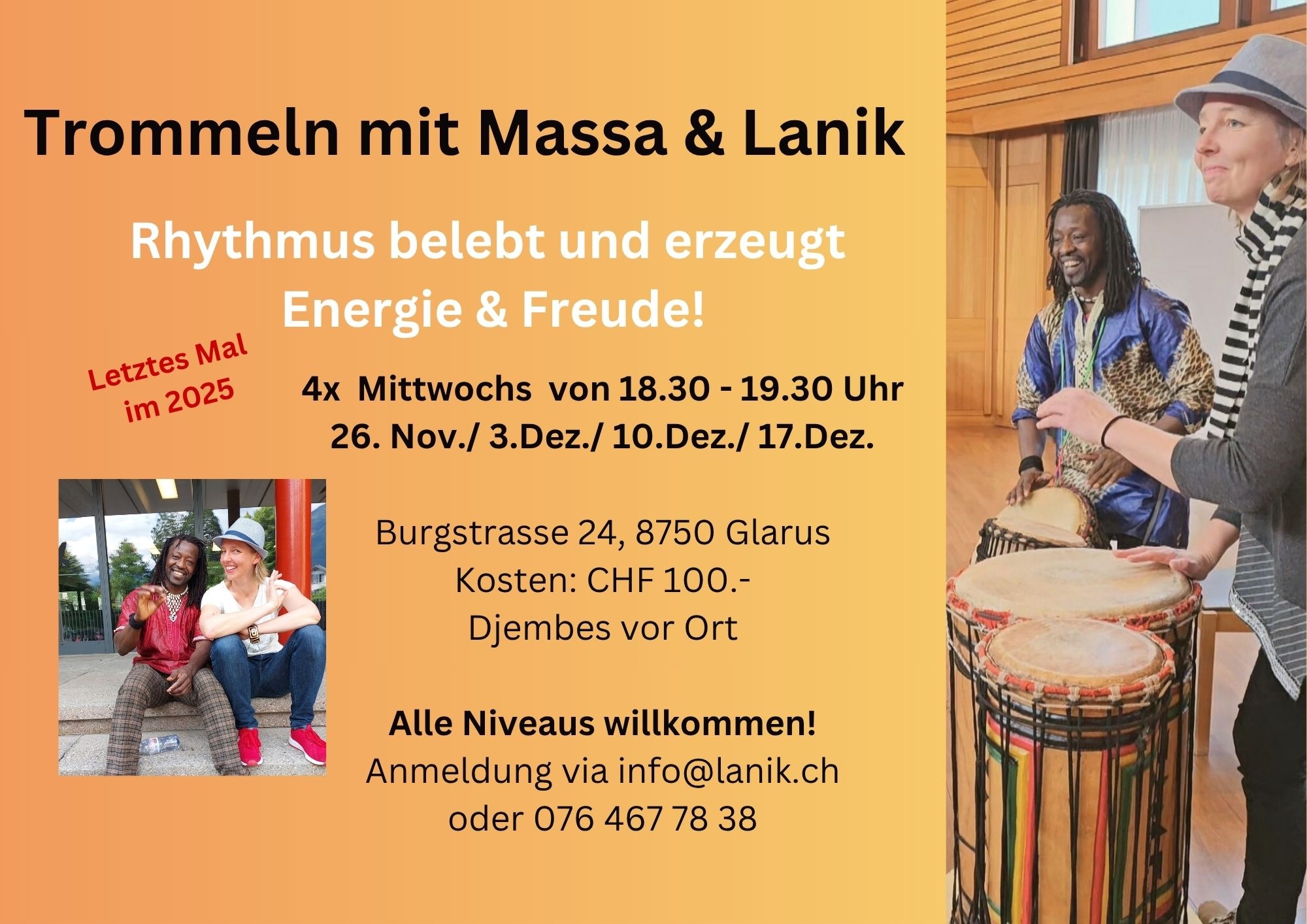 Kosten: CHF 100.-, Djembes werden zur Verfügung gestellt