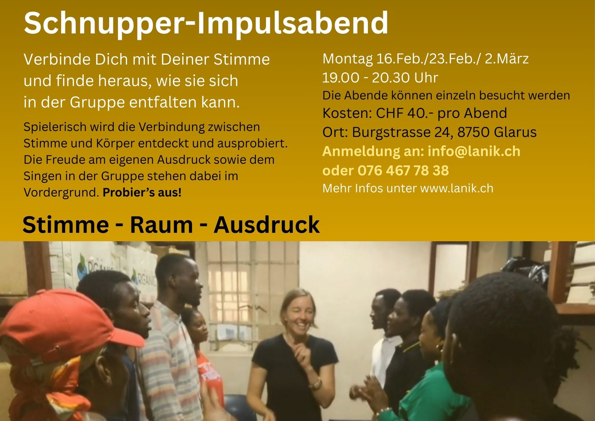 Anmeldung: info@lanik.ch oder 076 467 78 38